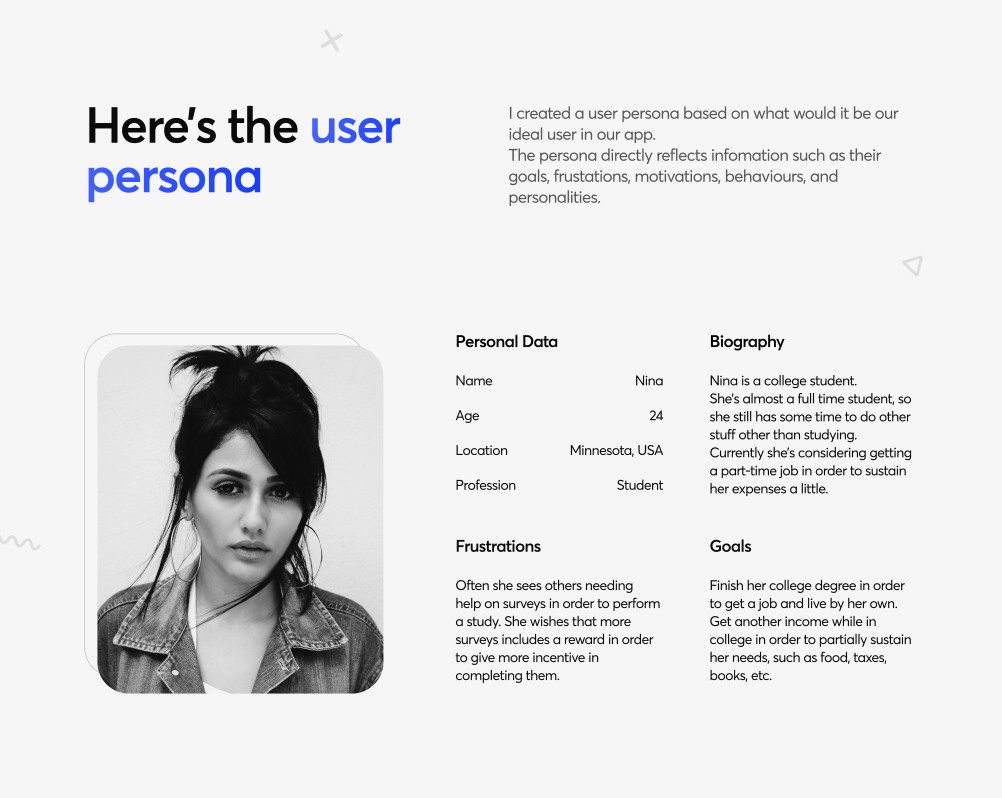 Here's an example of our ideal user persona, Nina. She's a 24 y/o student in college looking to get another income while doing college. This is one of the archetypes that I've come up with.