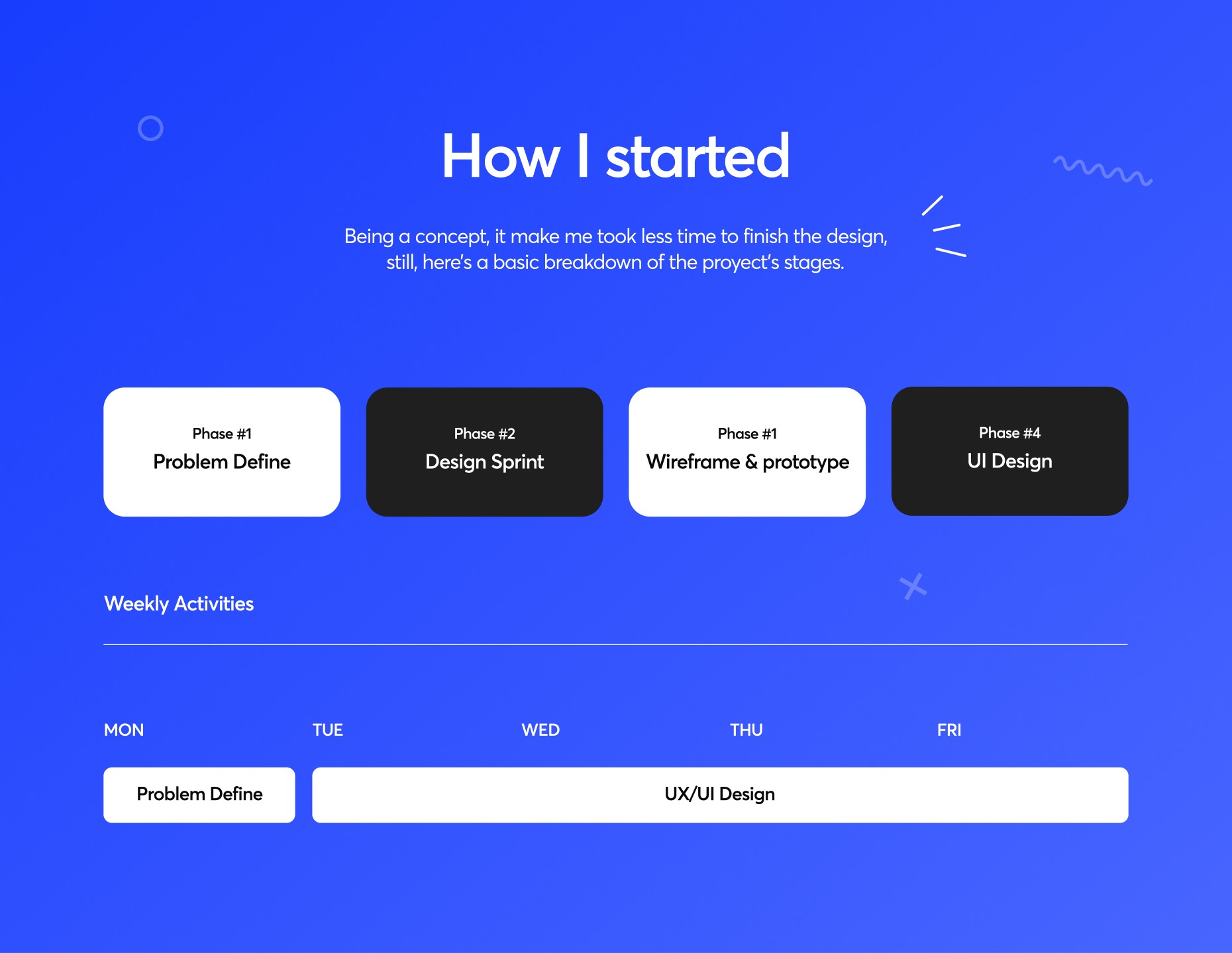 I divided the work in 4 phases; defining the problem, the design sprint, the wireframe & prototype, and the UI design.